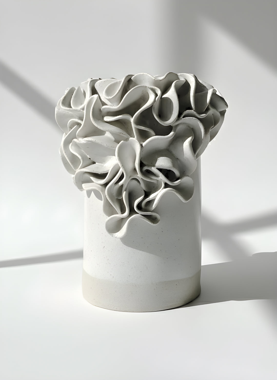 The recent body of work focuses on sculptural vases, shaped with ruffled folds and wave-like contours, capturing a sense of rhythm, motion and quiet energy.